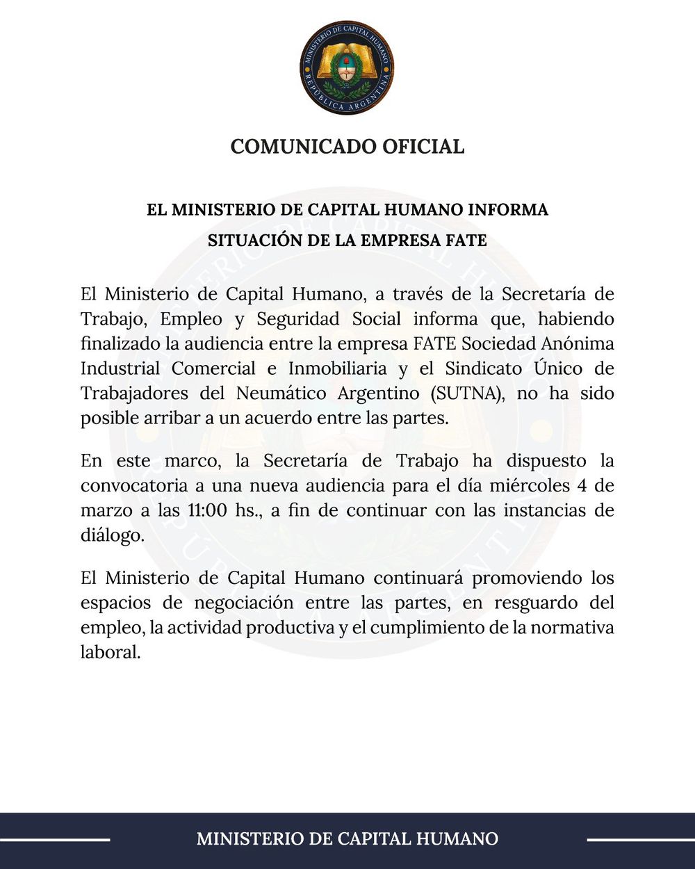 “En este marco -agrega el texto-, la Secretaría de Trabajo ha dispuesto la convocatoria a una nueva audiencia para el día miércoles 4 de marzo a las 11, a fin de continuar con las instancias de diálogo”. Y cierra: “El Ministerio de Capital Humano continuará promoviendo los espacios de negociación entre las partes, en resguardo del empleo, la actividad productiva y el cumplimiento de la normativa laboral”.